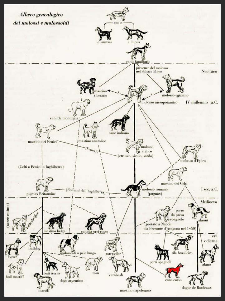 Claro esta, que no podemos tomar este árbol genealógico como perfecto. Y en este vemos a primera vista que no puede ser un “descendiente directo del canix pugnax romano” de un tipo de perro que fue clasificado hace 18 siglos por funcionalidad y no por su fenotipo, recordemos.
