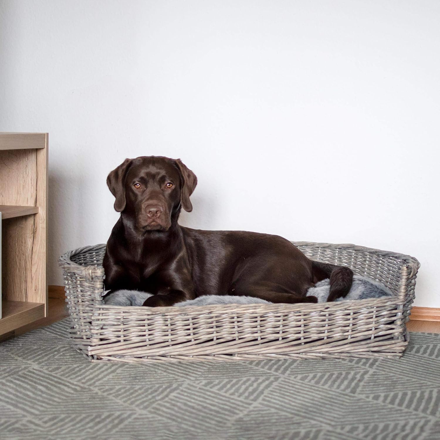 Cama para perros con cesta de mimbre: La cesta para perros XL ofrece mucha comodidad.
